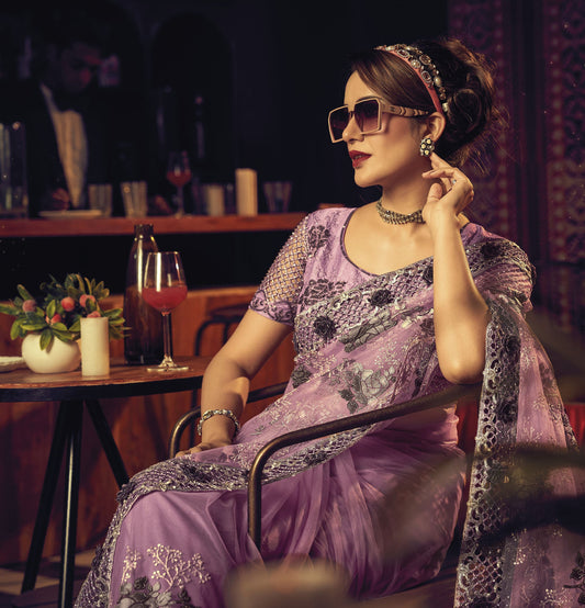 Pink Digital Floral Embroidery Digital Net Saree for Cocktail