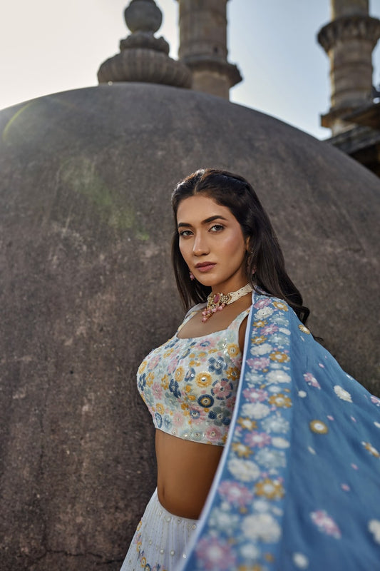 Sky Blue Embroidery Organza Silk Party Wear Lehenga Choli