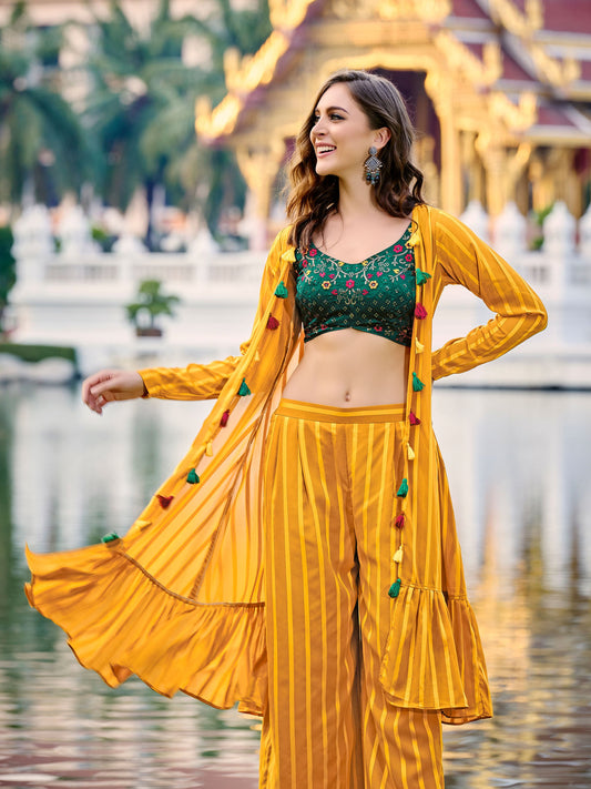 Yellow and Green Self Weaving Chinnon Crop Top Party Wear Set