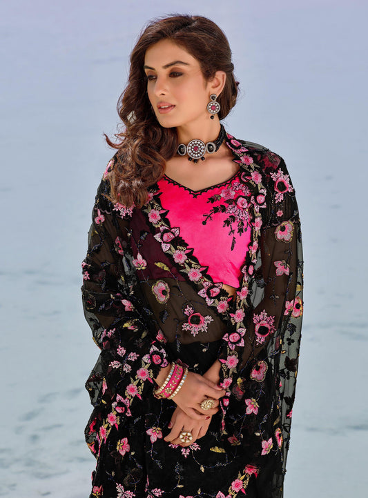Black Chinnon Silk Sequins Work Engagement Lehenga