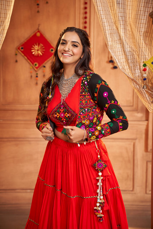 Red Viscose Rayon Thread & Mirror Work Navratri Chaniya Choli