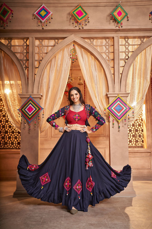 Navy Blue Color Mirror Work Viscose Rayon Navaratri Lehenga