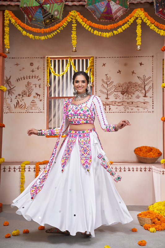 White Viscose Rayon Embroidery Mirror Work Navaratri Chaniya Choli