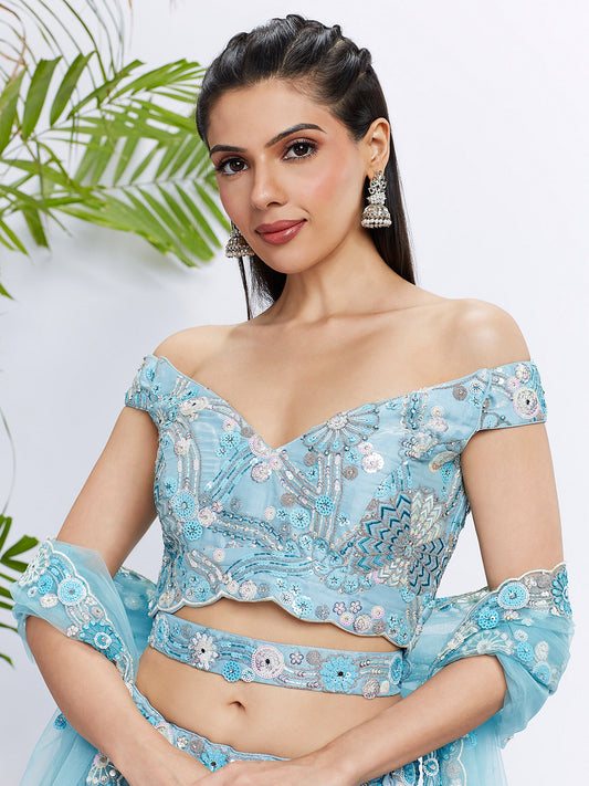 Turquoise blue Net Sequins and thread embroidery Lehenga