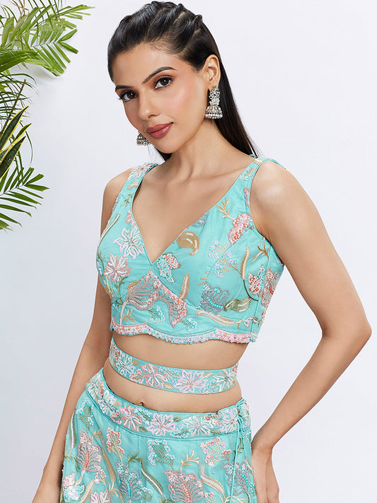 Turquoise blue Georgette Sequins and thread embroidery Lehenga
