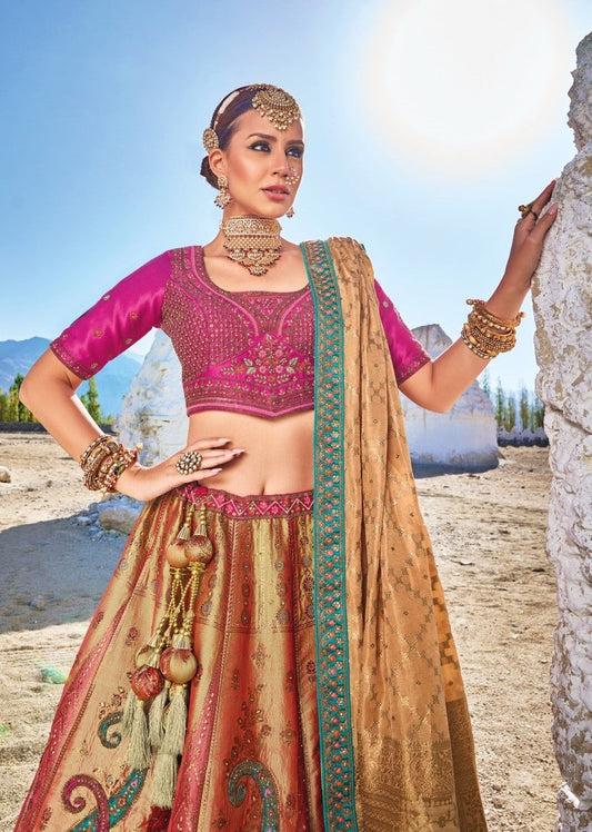 Dark Pink and Peach Color Sequins Embroidered Banaras Silk Bridal Lehenga