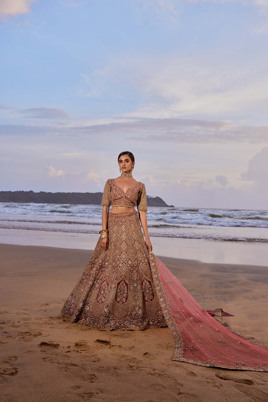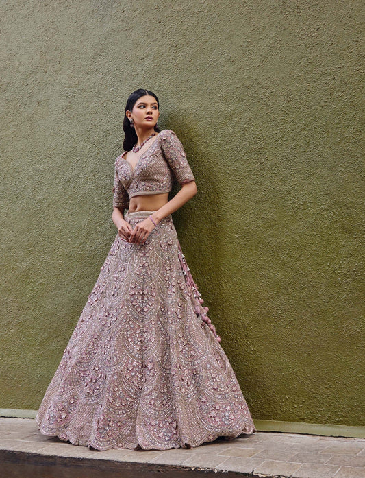 Mahavir Machine Embroidered Net Mauve Bridal lehenga