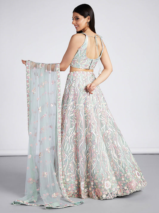 Turquoise Blue Net Sequins, Zarkan and thread embroidery Lehenga