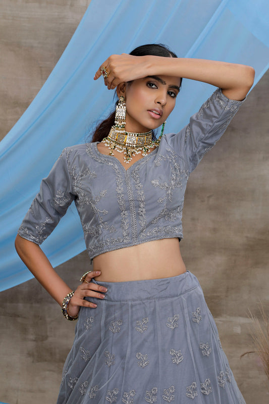 Dusty Purple Color Sequence Embroidery Net Lehenga